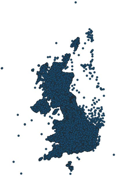 You should now be able to see all of the places from within the GeoNames file visualized within QGIS, covering all of Great Britain.  -