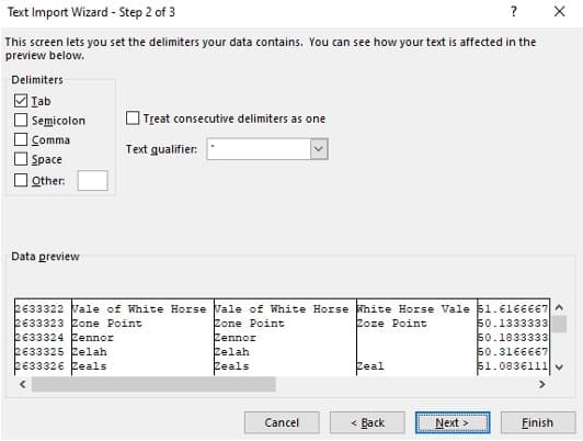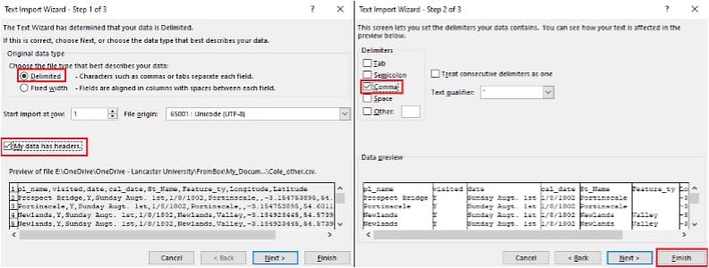- Click Next to proceed to Step 2, where you need to select your ‘Delimiters’: make sure Comma is selected. You can then click Finish (leaving the defaults selected for Step 3).