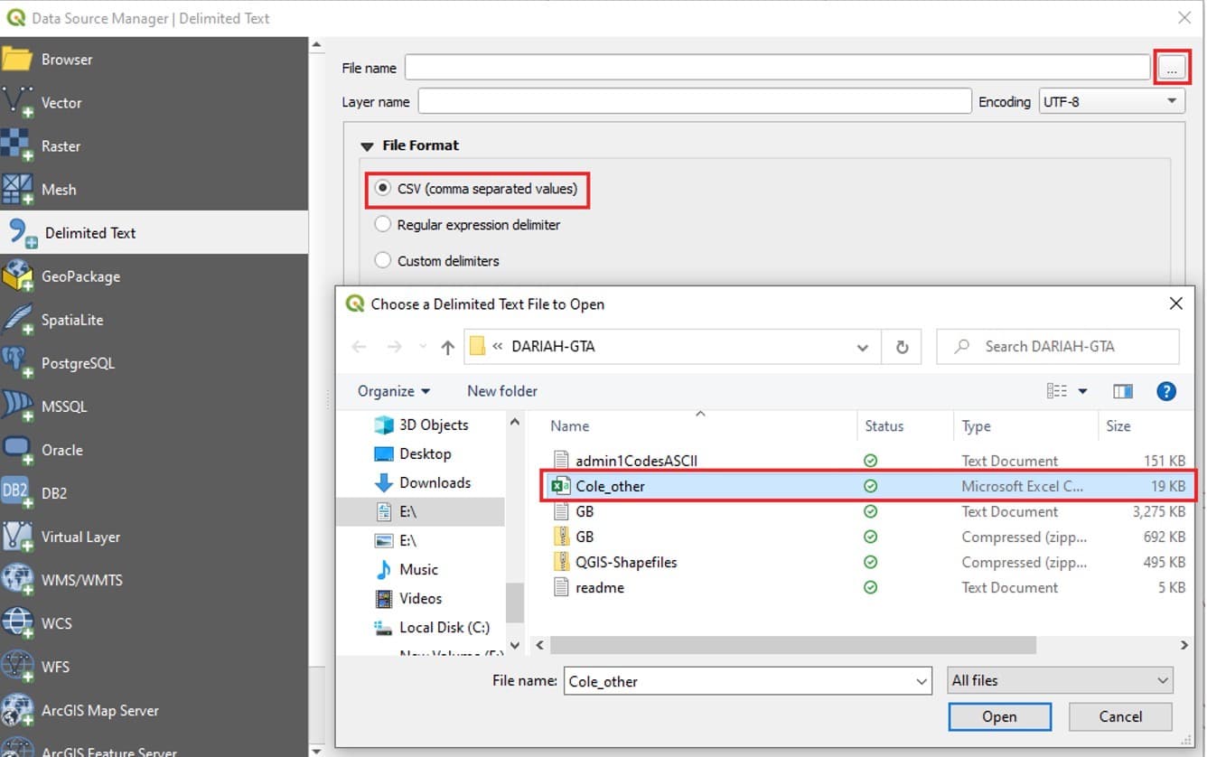 First, we will load the Cole_other.csv file into QGIS – this file already contains coordinates, so it is a straight-forward process to visualise this data in QGIS.