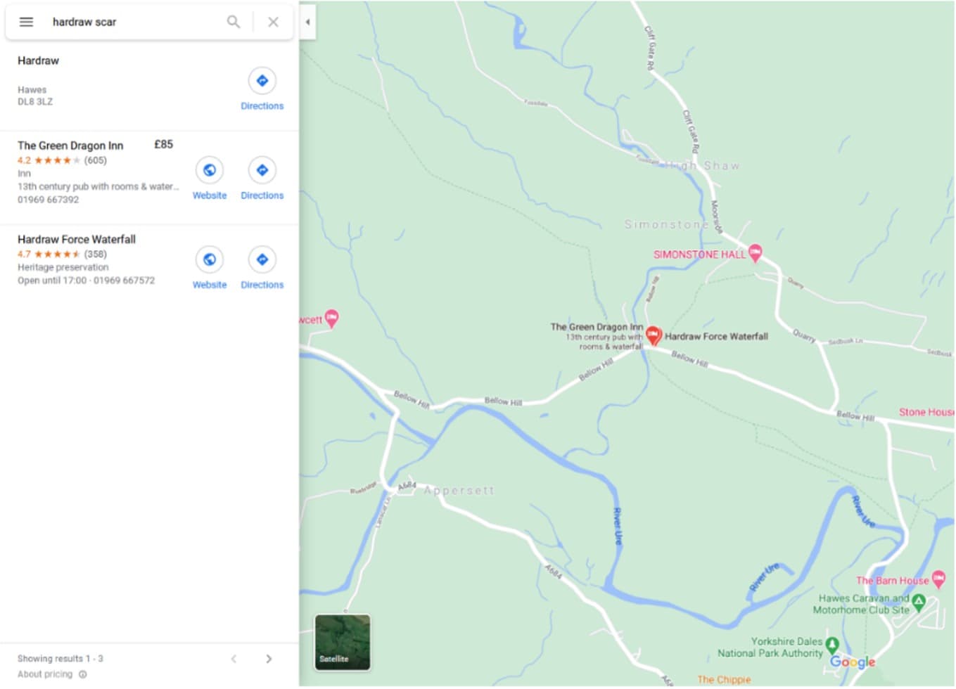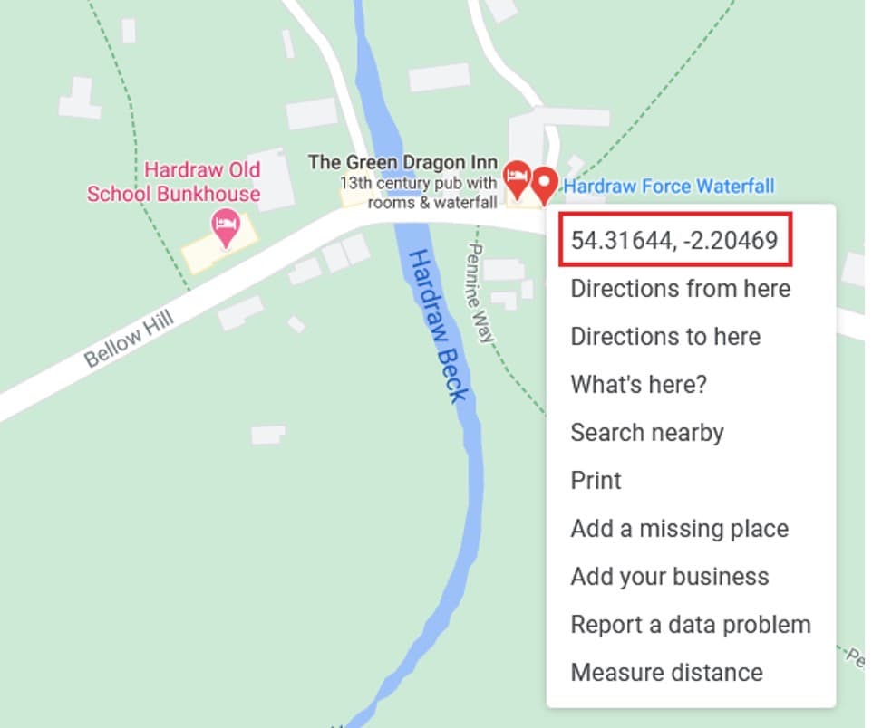 In this case, it is reasonable for us to equate Hardraw Scar with the Hardraw Force waterfall. To retrieve the coordinates, right click on the place-marker for Hardraw Force Waterfall on Google Maps. A sub-menu will appear, with the coordinates shown at the top.