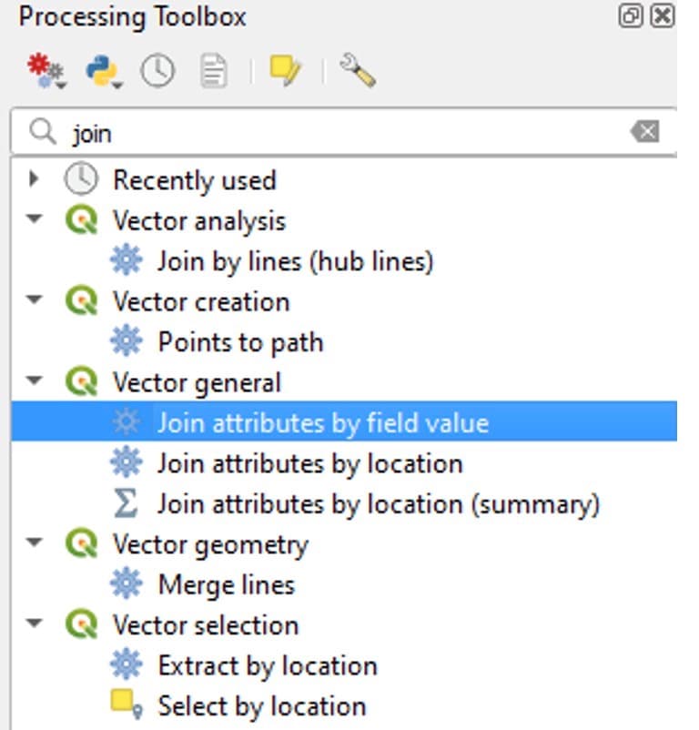 First, open the Processing Toolbox again (as we did in Step 3c) This time, type ‘join’ into the search box and locate Join attributes by field value (under the ‘Vector general’ heading). Double-click on this.  -