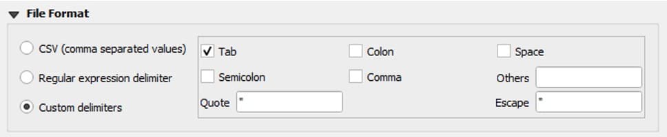 As in step 1c, you can add this new text file to QGIS by selecting Layer > Add Layer >Add delimited text layer and locating the GB_Gaz file. This time, however, we need to tell QGIS that this is a tab delimited file (rather than comma delimited). To do this, simply select Custom Delimiters under the File Format section, then select Tab. Click to add this data when you’re ready.  -