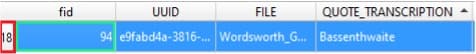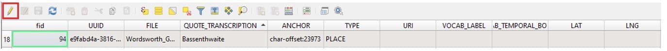 Within the ‘Wordsworth-Recogito-GPKG’ attribute table, left-click on the row header for your chosen place-name (i.e. the Feature id, not the ‘fid’ column) and make sure that this highlights the entire row, as shown in red below: