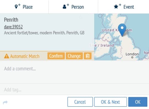 - Using its pre-loaded gazetteers, Recogito has identified an Automatic Match for Penrith. In this case, the automatic match is correct, so we can click Confirm. Make sure you then click OK to ‘save’ the annotation (otherwise, it will disappear!)