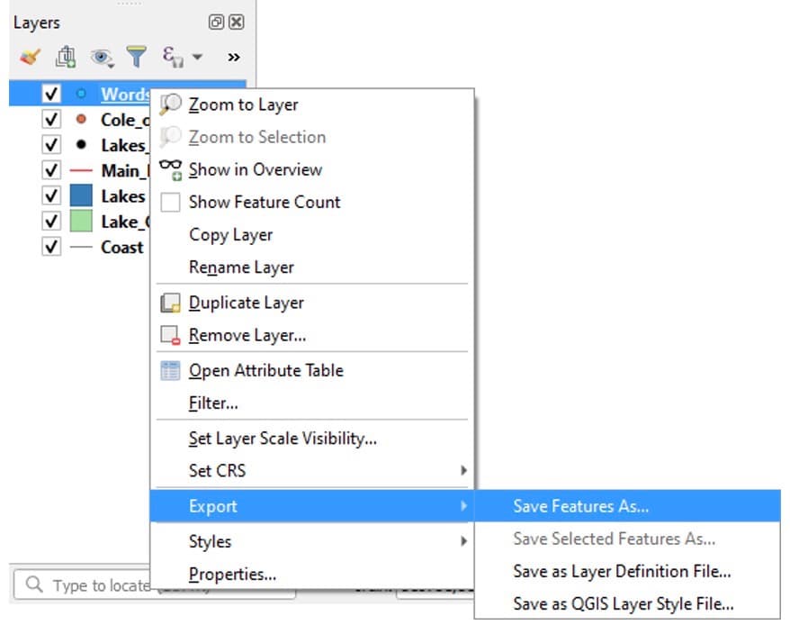 - Right-click on the Wordsworth-Recogito layer in your list of layers, and select Export > Save Features As…