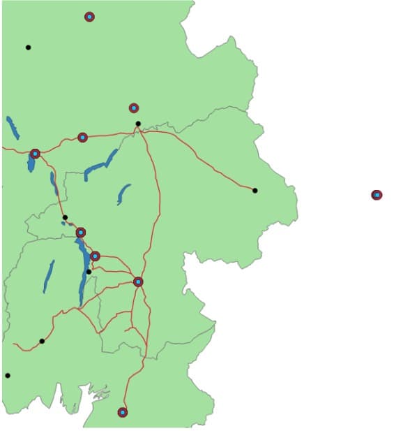 This will add a new layer to your QGIS project called ‘Joined layer’. As you might expect, this produces a point layer that (most likely) shows exactly the same locations that you were able to georeference within Recogito (mirroring your Wordsworth-Recogito layer). You can see this is the case on the example image to the right, with the larger red dots showing the Joined layer, and the lighter blue dots showing the Wordsworth-Recogito layer. -
