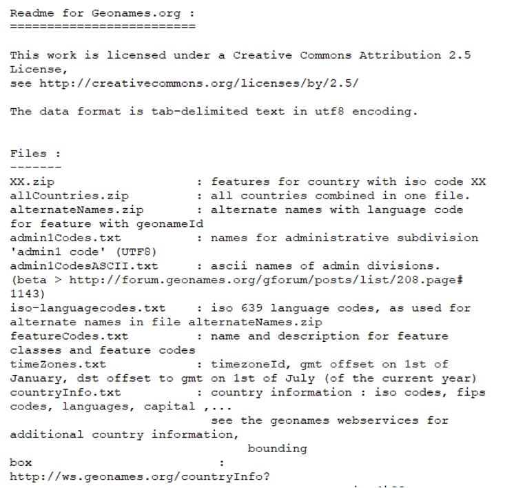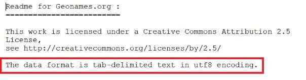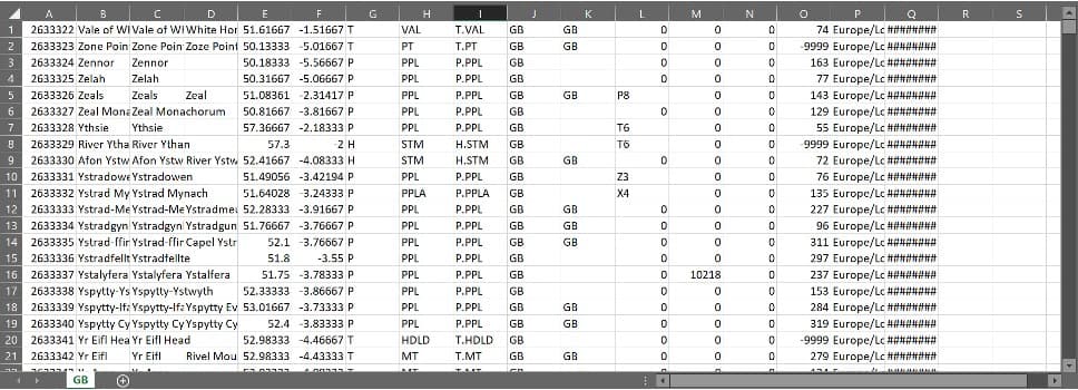 You will see that there are 19 separate fields in the gazetteer file. The most important ones are: - Three fields that contain place names (‘name’ is the basic one ‘ascii name’ and ‘alternatenames’ given varients on this)