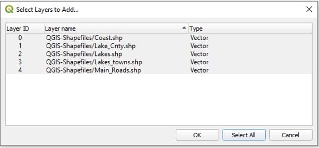 - Click Add within the Data Source Manager. QGIS will then ask you which Layers you would like to add. Select all those that appear within the ‘QGIS-Shapefiles’ folder, as follows: (Coast.shp; Lake_Cnty.shp; Lakes.shp; Lakes_towns.shp; Main_Roads.shp)