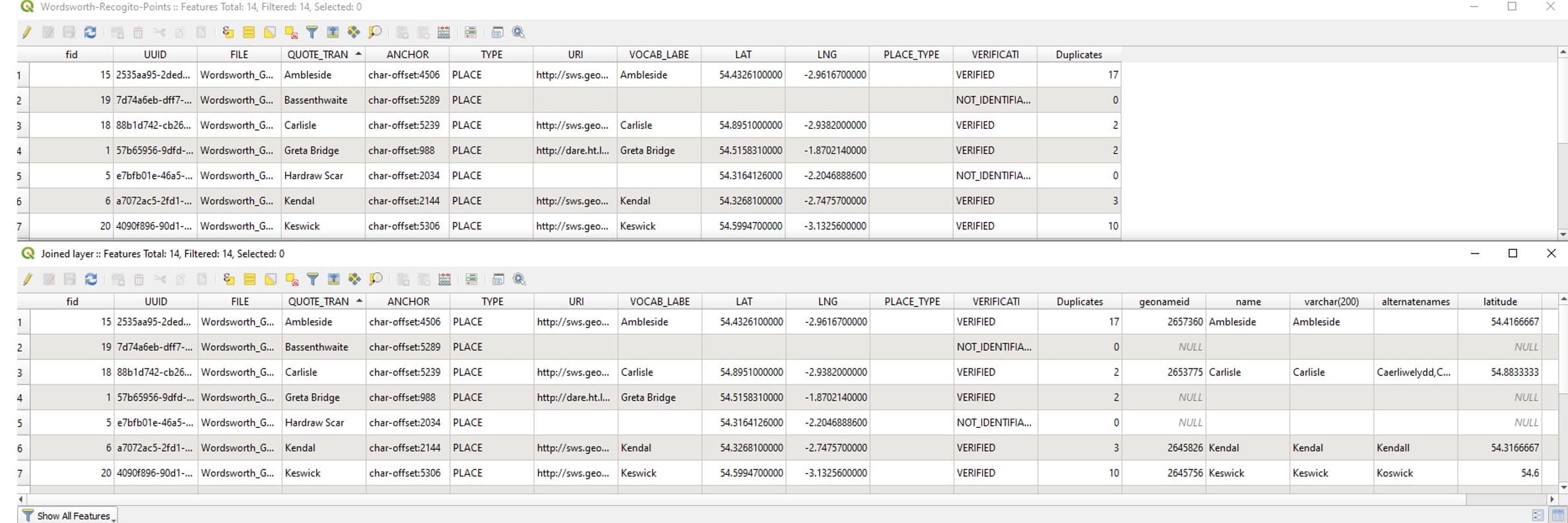 The vast majority of these places are not needed for our purposes, however. We can join our Wordsworth-Recogito-Points data to GeoNames’ GB_Gaz to create a new layer that combines this data. -