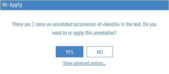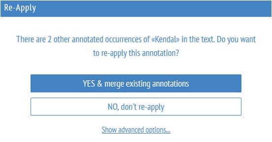 - Whenever you create an annotation in Recogito, it will automatically search the rest of your text to see if there are any repeat occurrences. If so, you can re-apply your annotation. Find Kendal (at the end of the third paragraph) and annotate it. When prompted, click YES to apply your current annotation to future occurrences.