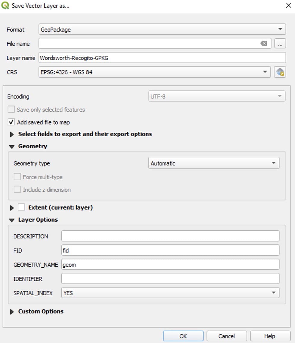 - Make sure the selected format is GeoPackage, then select the three dots next to ‘File name’ to choose where to save this new file on your computer, name it Wordsworth-Recogito-GPKG. Leave all the other settings as they are, and select OK when ready.