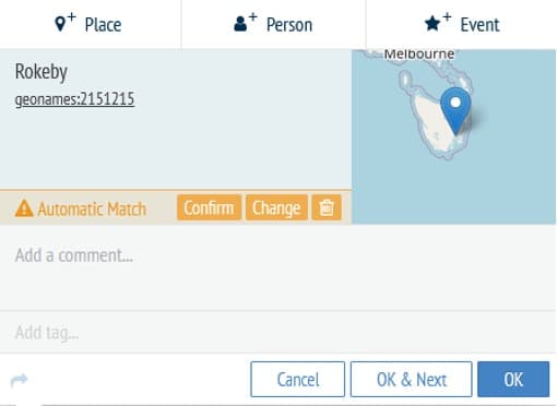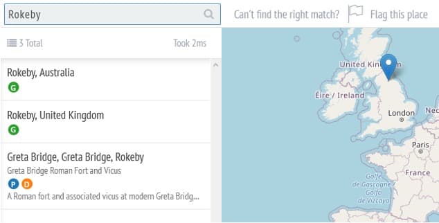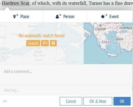 - Recogito uses multiple gazetteers, so the first ‘Automatic Match’ may not always be correct, or it may not be able to identify any match at all. To see what this looks like, annotate Rokeby (a few lines after Penrith)