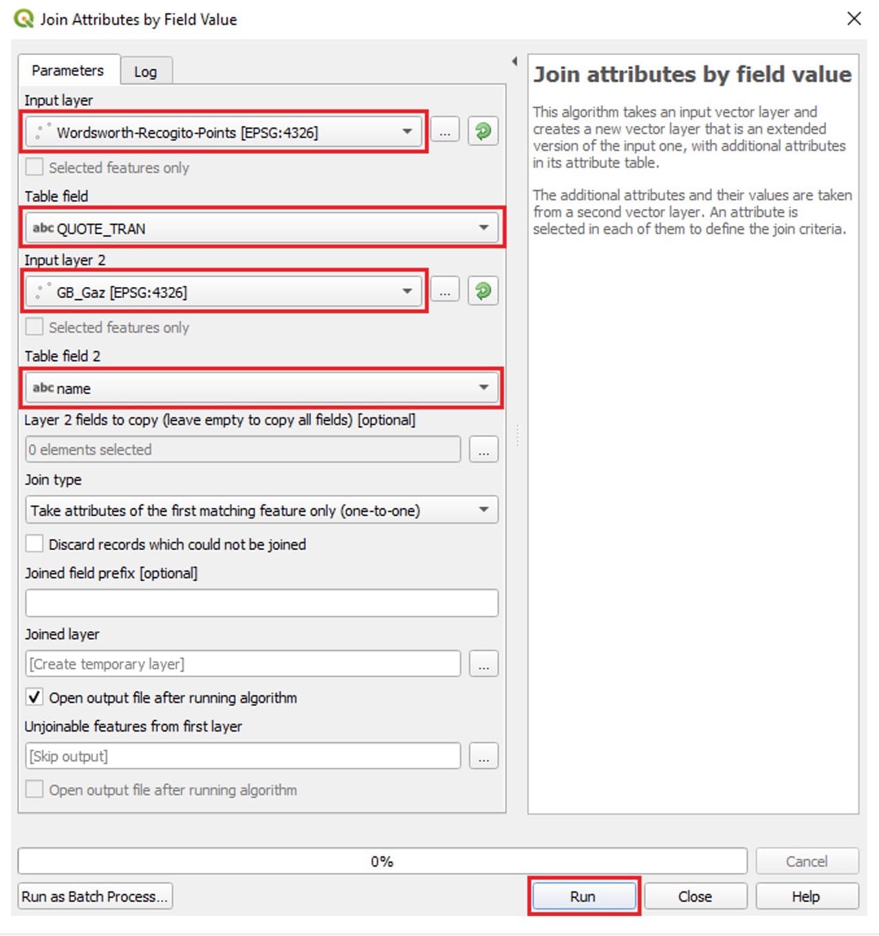 This will open the ‘Join Attributes by Field Value’ dialogue box. For Input layer, select Wordsworth-Recogito-Points, with the Table field as QUOTE_TRANSCRIPTION (this selects the column within Wordsworth-Recogito that contains the annotation you created within Recogito). For Input layer 2, select GB_Gaz, with Table field 2 as name. - This tells the Join Attributes tool to search both of these columns from each layer. It then extracts data from the second input layer whenever it encounters an exact match. This data is appended to our first input layer, to create a new layer that contains attributes from both our inputs.