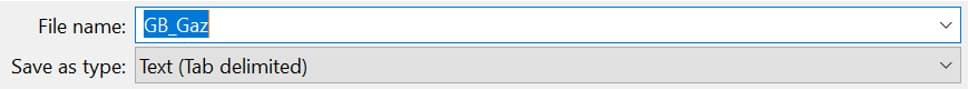 Finally, save the file as a text file by clicking Save As and selecting Text (Tab delimited). Call the file GB_Gaz.