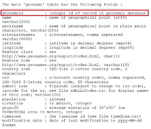 In addition to the field heading, the information after the colon (:) provides some additional metadata about the content of the field. Thus, we are told that the entries in the ‘geonameid’ field are integer (numerical) identifiers.