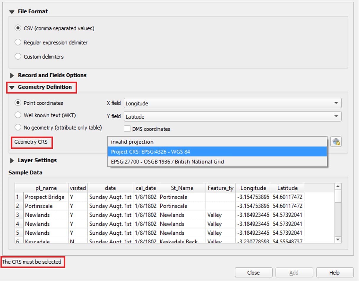 Return to your QGIS project and select Layer > Add Layer >Add delimited text layer from the drop-down menus at the top. Locate the .csv file we just downloaded and updated (Wordsworth-Recogito.csv), and follow the same procedure as in Step 1c. Make sure ‘X field’ is set to LNG (longitude) and ‘Y field’ to LAT (latitude)