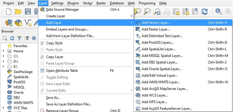 - We can now start loading our other data. Once again, select Layer > Add Layer from the drop-down menu. This time, though, we will use Add delimited text layer.