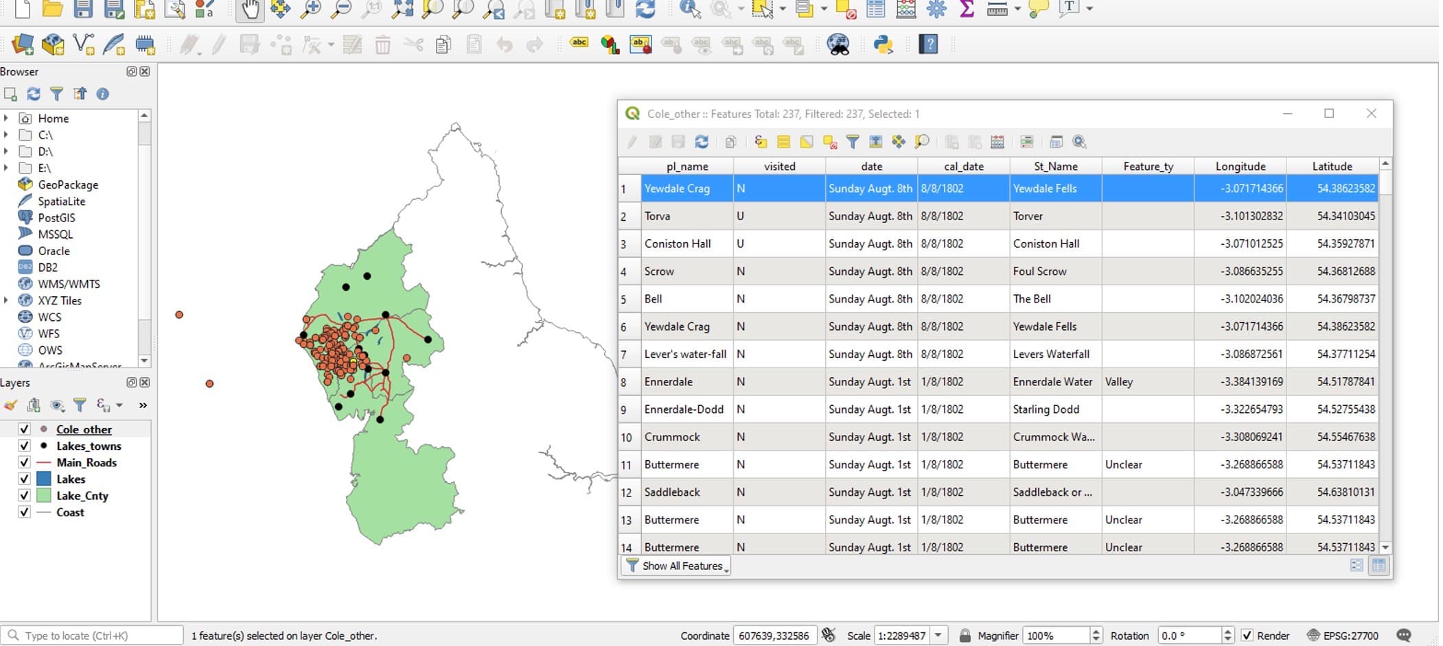 - Consider what types of research question you could ask/answer with your Wordsworth and Cole datasets. What other spatial information might you need to answer more complex questions? How would you account for any places that you were unable to locate, and are therefore missing from your GIS dataset?