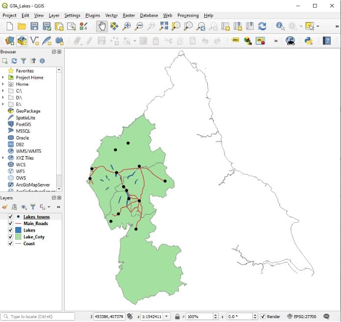 Open a new QGIS project and save it as GTA_Lakes. - NOTE: Make sure to keep saving your QGIS project regularly throughout the tutorial!