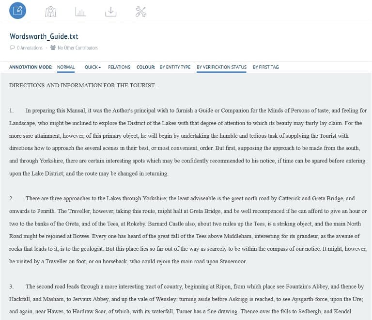 The file Wordsworth_Guide.txt is an excerpt taken from Wordsworth’s A Guide through the District of the Lakes in the North of England. The file contains the text from the first chapter ‘Directions and Information for the Tourist’. We are going to use Recogito, a free online annotation tool for texts and images, to identify and extract the place-names within.