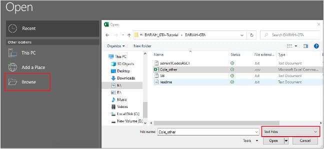 - When the dialog box appears, navigate to location where you saved the DARIAH-GTA folder earlier, and make sure to change the menu in the bottom right corner from All Excel Files to Text Files (see above).