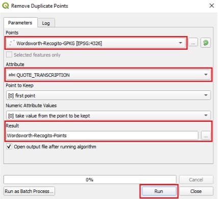 When the Remove Duplicate Points window opens, select your ‘Wordsworth-Recogito-GPKG’ layer for the Points option, then select ‘QUOTE_TRANSCRIPTION’ for the Attribute option. This tells the tool to search this column from our table to identify any duplicates.