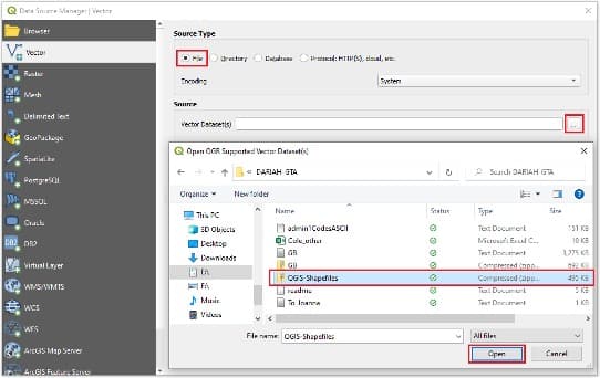 - This opens the ‘Data Source Manager’ – click the three small dots next to ‘Vector Dataset’ and navigate to the DARIAH-GTA folder you downloaded earlier, locate the QGIS-Shapefiles.zip file within the folder and click to Open this file.