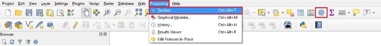To start manipulating our data, we need to open the Processing Toolbox in QGIS. To do this, you can select Processing > Toolbox from the drop-down menu at the top, or you can click on the ‘gear’ icon highlighted in red below:  -