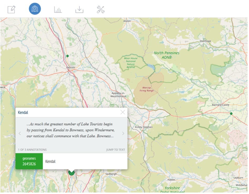 - Now that we have annotated a few places, click on the Map View at the top of the screen. You will be able to see that all three places now appear on our map. Furthermore, because Kendal appears three times in our text, it appears as a slightly larger ‘dot’ on our map to reflect its frequency in the text.