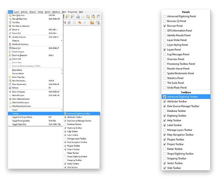 To do this, we will use the Advanced Digitizing Toolbar. We need to open this toolbar by right clicking anywhere in the toolbars located at the top of your QGIS window, then ticking the ‘Advanced Digitizing Toolbar’ option. This can also be accessed by clicking View > Toolbars > Advanced Digitizing Toolbar.