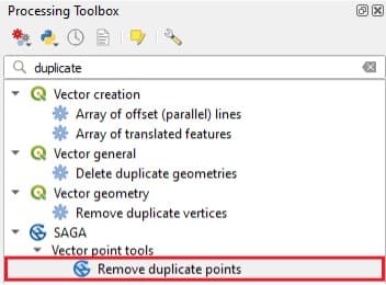When the Processing Toolbox appears on your screen, search for ‘duplicate’ in the ‘search’ bar. Double-click with the left mouse button to open the Remove duplicate points tool.