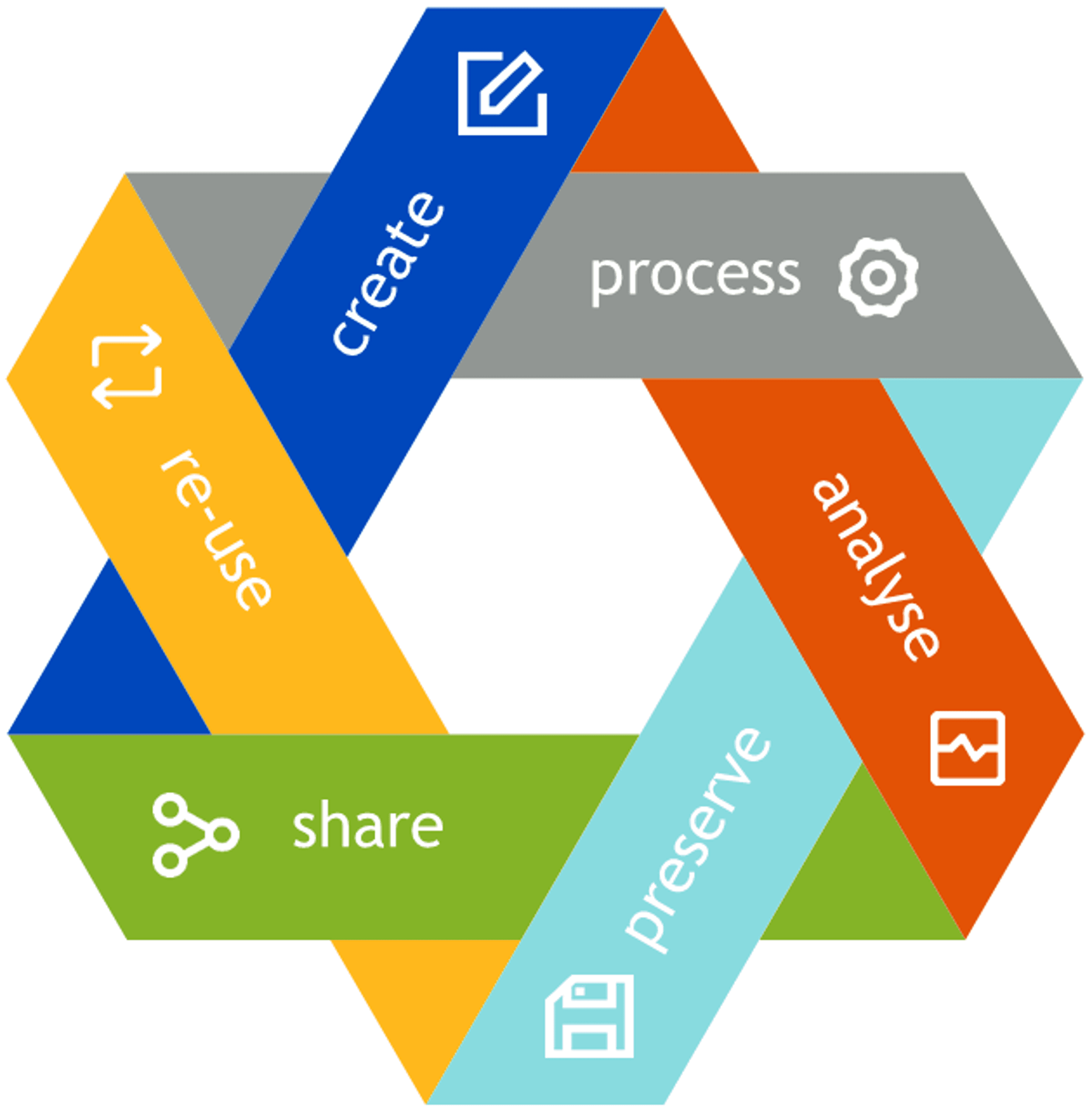 Üblicherweise haben (Forschungs-)Daten eine über ein konkretes Projekt hinausgehende Lebensdauer, was mit Hilfe des sogenannten Datenlebenszyklus (data life cycle) visualisiert wird: Im Laufe eines Forschungsprojekts werden Daten generiert (create), bearbeitet (process), analysiert (analyse), aufbewahrt (preserve), geteilt (share) und – im besten Fall – wiederverwendet (re-use). Die Grafik symbolisiert sehr gut, dass der Lebenszyklus von Daten aufrechterhalten werden sollte, damit die Bearbeitung darauf aufbauender Fragestellungen ermöglicht wird. Außerdem kann die Generierung von Daten oftmals kostenintensiv sein, weshalb eine langfristige Aufbewahrung der gewonnenen Daten besonders wichtig ist (siehe: IANUS, Lebenszyklus, und UK Data Service).